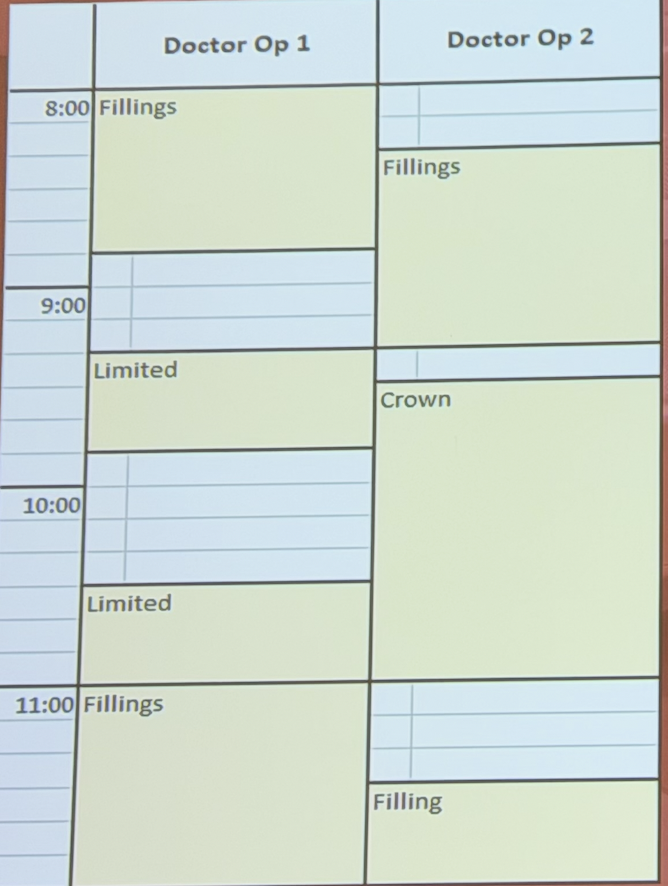 Let’s take a look at Figure 1 (a dental schedule, but the logic is identical to an ophthalmology lane schedule).