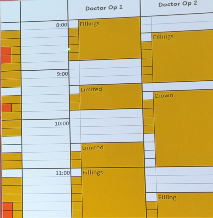At first glance it looks calm. In OP1 (lane 1), there’s a patient at 8:00, then 9:20, then 10:30, then 11:00. In OP2 (lane 2), it also looks okay: a filling at 8:20, a crown at 9:30, and another filling at 11:30.